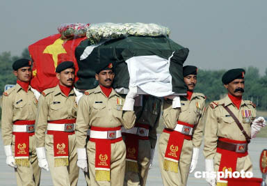 巴基斯坦礼兵抬着王鹏的灵柩走向专机