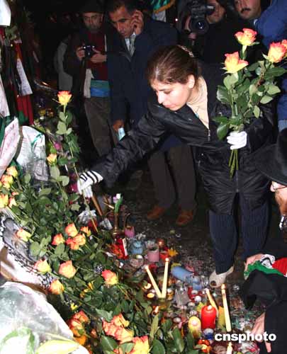 一名阿族女子在阿拉法特就诊的巴黎贝尔西(Percy)军医院墙外的阿拉法特画像前献花。作者:钟诚