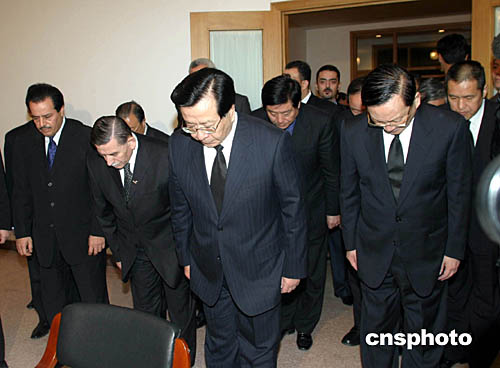 曾庆红、唐家璇在巴勒斯坦国驻华使馆内的阿拉法特灵像前默哀。