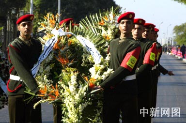 11月12日,在埃及首都开罗,埃及士兵抬着向已故巴勒斯坦民族权力机构主席阿拉法特敬献的花圈。