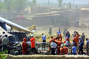 记者在事发后一小时赶到现场,发现已有数十辆消防车停在失事飞机周围,身着橙红色消防衣的警察已走进飞机内部进行消防工作。在离失事飞机约三十米的一块空地上,早已停满了各式车辆,约有近千名武装警察在维持秩序,他们甚至动用了大狼狗。