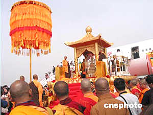在仪式上,一诚法师、觉光法师、学诚法师分别拈香,诵经、跪拜。来自西安大慈恩寺六十多名僧侣仪仗队高奏佛乐,数百名佛家居士齐声念佛。