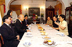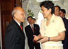 刘延东快步走上前去与霍英东先生握手问好。她详细地问起霍先生最近的身体状况和作息起居,还转达了胡锦涛、江泽民、贾庆林、曾庆红等中央领导人对霍先生的问候。