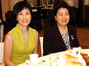 5月26日,香港著名艺人汪明荃盛装在君悦酒店出席活动,与访港的全国政协副主席、中共中央统战部部长刘延东见面。作者:洪少葵