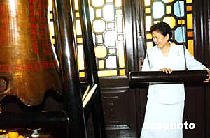 正在香港访问的全国政协副主席、中共中央统战部部长刘延东,五月二十七日来到香港观宗寺参观,在大雄宝殿敲钟祈福。 作者:钱兴强