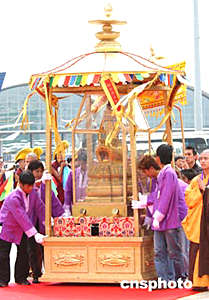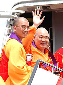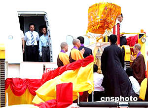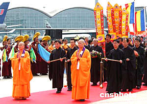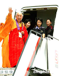 中国佛教协会副会长圣辉法师五日上午在香港国际机场登上恭送佛指舍利专机,护送佛指舍利回法门寺。中新社记者:赵振清