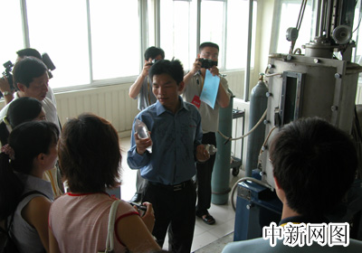 “网上河北行”采风团参观访问秦皇岛经济技术开发区中的华博晶体技术有限公司,该公司抓住以蓝宝石为衬底材料的蓝色、绿色和白色LED和LD产业快速发展契机,目前已发展为国内最大的蓝宝石生产基地。图为该公司负责人向记者们展示产品加工过程。(秦欣摄)