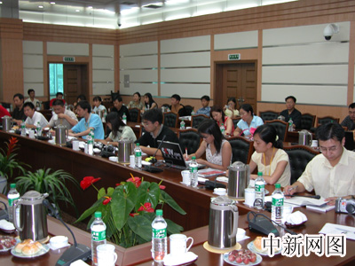 第二届“网上河北行”采风团的记者们21日来到唐山市采访,唐山市政府领导召开市情说明会向记者介绍了唐山现状。图为说明会现场。(秦欣摄)