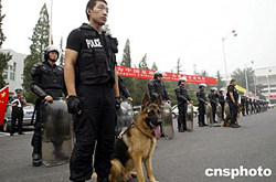 8月7日,在亚洲杯决赛中国队对日本队的比赛开赛之前,大批的防爆警察进驻北京工人体育场,确保赛场的安全。图为一名防爆警察为同伴擦汗。中新社记者:盛佳鹏