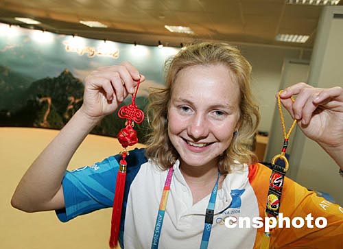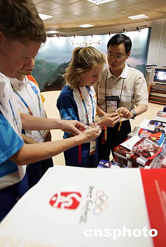 (当地时间)二○○四年八月八日,2008北京奥运会组委会在希腊雅典奥运会新闻中心设立展台,宣传北京奥运以及新北京的面貌。中新社记者:毛建军