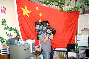 这次活动是由大阪的中文报纸《关西华文时报》策划组织的,地点在市中心的中华城,数十名中国人球迷在鲜艳的五星红旗下,高举“祖国万岁”的标语牌,边观看大屏幕电视,边为中国队呐喊助威的。日本有名的电视台每日电视台专门派出了一个摄制小组进行现场采访。