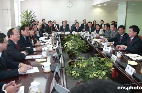 国家民航总局副局长高宏峰(右一)等一月十日在北京与以国民党中央政策会执行长曾永权(左三)为团长的“推动台商春节包机参访团”举行会谈,国民党籍民意代表章孝严(左二)等参加会谈。作者:满会乔