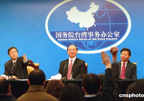 国台办一月十二日在北京举行新闻发布会,邀请国务院台湾事务办公室经济局局长何世忠(中)、海峡两岸航空运输交流委员会副理事长浦照洲(右一)就台商春节包机问题回答记者提问。作者:满会乔