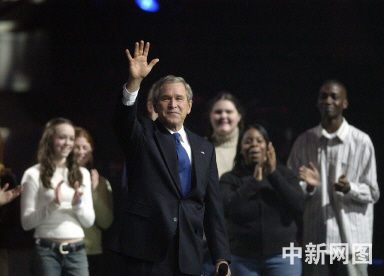 1月18日,美国总统布什出席由他的女儿在华盛顿哥伦比亚国家警备厅举办的青年音乐会,此活动为布什总统第二任期就职典礼的一部分。图为布什发表演讲后向大家致意。