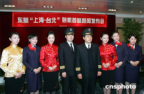 一月十九日,东航“上海—台北”包机飞行的机组人员在上海正式亮相。身着绣满中国传统“双飞蝶”图案唐装的东航空姐,将在该包机航班上提供空中服务。届时,上海浦东国际机场的值机区域、头等舱休息室、VIP和头等公务专车等处,安排着唐装的地面服务人员也将为旅客提供咨询引导等服务。富于浓郁台湾风味的“佳肴”也将出现在航班上。作者:潘索菲