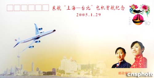 一月二十七日,中国东方航空股份有限公司特意制作了该公司“上海——台北”台商春节包机首航纪念信封,准备赠送给二十九日搭乘包机返乡的台胞旅客。作者:汤彦俊