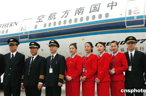 南方航空公司将执行台商春节包机任务,担当首航任务的南航CZ3097航班的机组人员一月二十七日亮相广州新机场停机坪。作者:陈文