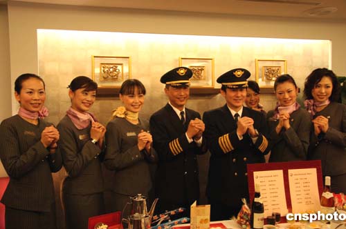 台湾“复兴”航空首航台商春节包机机组人员,一月二十八日上午与媒体见面。作者:邢利宇