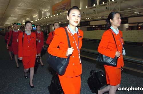 一月二十九日晨,南航厦航台商春节包机首航仪式在广州白云国际机场举行。南航的CZ3097航班和厦航的MF881航班分别于八时、八时十五分满载台商从广州飞往台北,南航CZ3097航班也成为五十六年来首架降落在台湾的祖国大陆民航客机。图为南航空姐靓装上岗。作者:陈文
