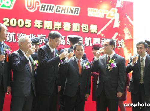 图为两岸民航业者为春节包机首航高雄获得成功祝酒庆贺。作者:陈立宇