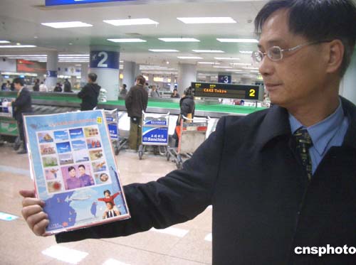 二00五年台商春节包机二十九日首次实现两岸双向对飞,台湾首班飞抵北京的华航CI581班机于十一点五十八分到达北京首都机场,华航为此特发行纪念邮票一套,并在飞机上赠送给旅客。作者:路梅