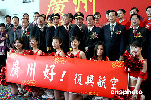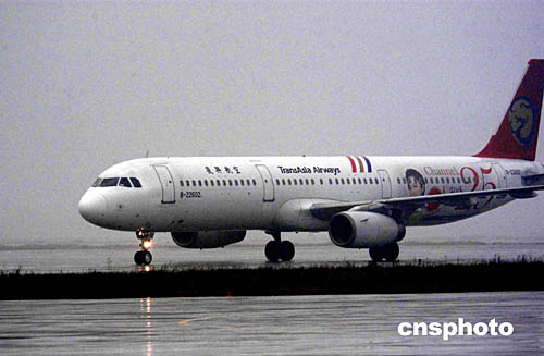 二月四日上午,台湾复兴航空公司的A321飞机在浓雾中平稳地降落在广州新白云机场。这是台湾地区第一家航空公司首航台北至广州。
