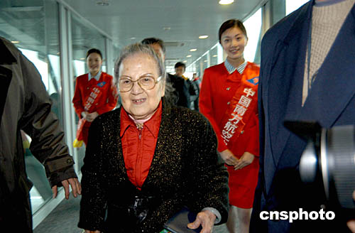 图为今年已经八十六岁梁老太,在儿子的陪同下,成为第一个走出机舱的旅客。作者:刘卫勇