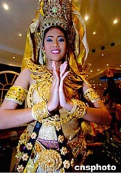 15日晚的泰国布吉岛一旅游点上,一首饰点的模特儿在向顾客祝福。海啸地震过后,这里旅游业正在逐步复苏。作者:宋吉河