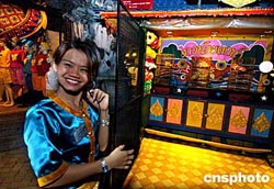 15日晚的泰国布吉岛一旅游点上,一位小老板正在笑迎客人。海啸地震过后,这里旅游业正在逐步复苏。作者:宋吉河