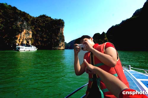 16日的泰国布吉岛海面上风平浪静,游船上的情绪高昂,尽情享受大自然风光。海啸地震过后,到这里旅游的客人日益增多,当地旅游业正在逐步复苏。作者:宋吉河