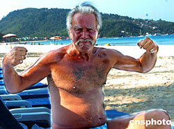 在一处海滩旅游景点上,一位老年游客展示其健壮身躯,表达海滩旅游的热趣。海啸地震过后,布吉岛当地相关方面积极刺激旅游业发展,目前游客人数日益增多,往日的繁荣正在逐步复苏。作者:宋吉河