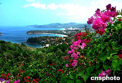 2月中旬的泰国布吉岛三海风光旅游区,风和日历,绚丽的山花映衬着碧蓝的大海,展现出一幅美丽画卷。