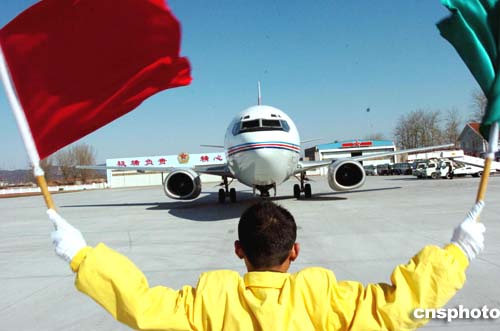 图为北京西郊机场地勤工作人员引导安徽省代表团所乘飞机进入停机坪。作者:陈文