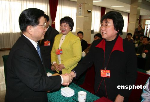 中共中央政治局常委、国务院副总理黄菊三月四日下午看望参加全国政协十届三次会议的全国总工会、福利保障界的委员,并参加联组讨论。图为黄菊副总理(前左)与许德馨委员握手。作者:闻育旻