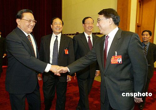 三月八日,全国人大吉林代表团在北京人民大会堂审议《反分裂国家法(草案)》。中央政法委员会书记罗干参加审议。作者:廖文静