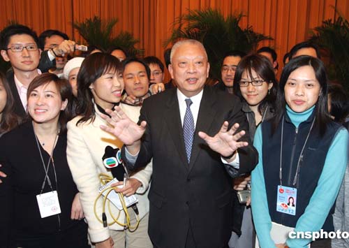 全国政协十届三次会议三月十二日下午闭幕后,新当选的全国政协副主席董建华在北京政协礼堂举行新闻发布会,并与现场采访的香港记者们合影。作者:毛建军
