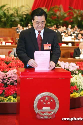 十届全国人大三次会议三月十三日上午在北京人民大会堂举行第四次全体大会,代表们投票选举中华人民共和国军事委员会主席。图为胡锦涛投票。作者:毛建军