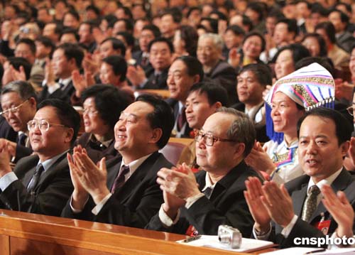 图:代表鼓掌祝贺反分裂国家法高票通过