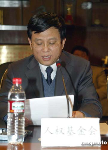 图为中国人权发展基金会副会长林伯承宣读声明。作者:史利