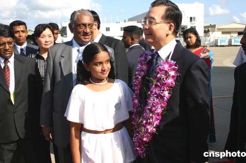 中国国务院总理温家宝今天下午抵达斯里兰卡首都科伦坡,图为温家宝愉快地接受斯里兰卡少女献花。作者:齐彬