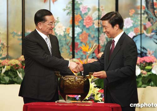 会见时,中共江苏省委向访问团赠送了过去专为皇家制造、现成为南京艺术象征的丝织工艺品“金丝团龙”,李源潮说,龙是中华民族的象征。连战主席也回赠了一件台湾名家制作的工艺品三羊开泰瓷瓶。连战说,以此祝愿江苏发展、兴旺。