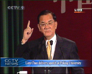 连战说,我这一次到大陆来访问,我说“来的不易”,因为有若干的人很迟疑,甚至于有一种批判,认为我到这里来,是为了进行所谓“第三次的国共和谈”,所以我的目的是要“联共制台”,那个“台”下面还是有个“独”字。