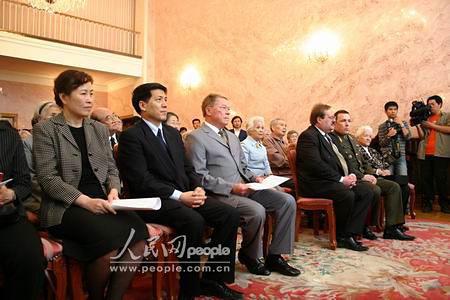 中新网4月30日电 俄罗斯驻中国大使罗高寿29日向为苏联卫国战争做出贡献的27名中国人颁发了“1941-1945年伟大卫国战争胜利60周年”纪念章。获得纪念章的27人包括:毛泽东之子毛岸青、刘少奇之女刘爱琴、朱德之女朱敏等。