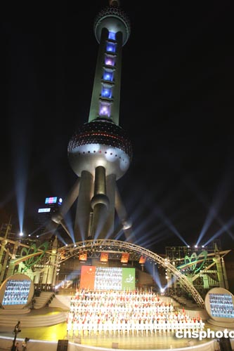 中新社上海四月三十日电 (记者 王欢)黄浦江畔璀璨的夜景中,以“团结、友谊、交融、发展”为主题的第四十八届世界乒乓球锦标赛开幕式今天在上海东方明珠电视塔广场举行,这也是这一国际乒联最高水平的赛事第三次落户有着“乒乓王国”之称的中国。