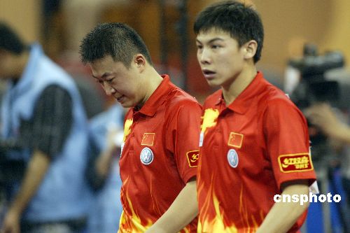 五月四日,在上海体育馆进行的第四十八届世界乒乓球锦标赛男双半决赛中,雅典奥运会冠军马琳、陈玘以一比四不敌德国新搭档苏斯、波尔,无缘决赛。这也使中国选手提前获得男双冠军的希望落空。图为马琳(左)、陈玘黯然离开赛场。 作者:盛佳鹏