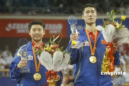 中新社上海五月四日电 (记者 王欢)昨天被中国队提前签收的混合双打金牌,今天正式归于王励勤/郭跃名下,两人以四比三战胜队友刘国正/白杨获得了本届世乒赛上的第一枚金牌。