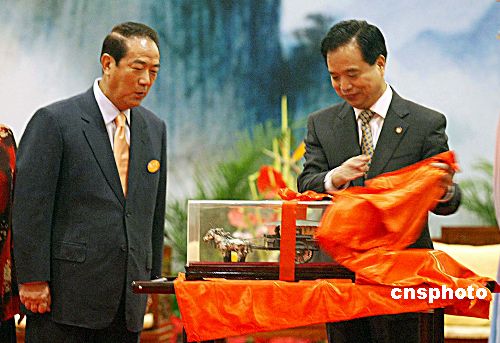 图:李建国向宋楚瑜赠送铜车马