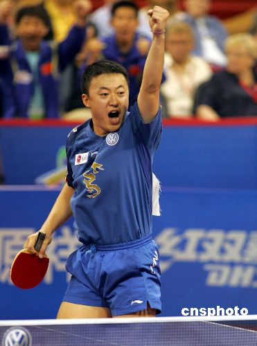 五月六日,在上海体育馆进行的世乒赛男单半决赛中,中国选手马琳以四比零轻取丹麦“黑马”梅兹,与王励勤会师男单决赛,这也使得中国队在本届世乒赛提前揽五冠。作者:汤彦俊