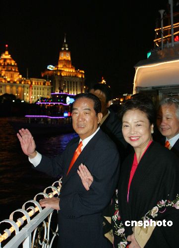 中新社上海五月七日电(记者许晓青 曾嘉)华灯璀璨,在一阵阵江南童谣声中,亲民党主席宋楚瑜携夫人陈万水登上了“上海风采”号游船,夜游黄浦江。宋楚瑜夫妇在船舷上感慨:“百闻不如一见”,宋楚瑜还饶有兴致地操起沪语,惊叹说:“变化大得不得了!”