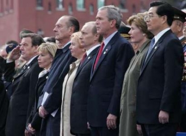 在世界反法西斯战争胜利六十周年之际,世界各地举行了各种庆祝仪式,其中尤以今天在此间举行的俄罗斯纪念卫国战争胜利六十周年庆典最为隆重,包括中国国家主席胡锦涛在内的世界五十多个国家的元首、政府首脑和国际组织代表出席了在红场举行的庆典活动。